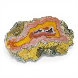 This exquisite Laguna Agate showcases a captivating fortification, displaying a remarkable chromatography phenomenon from gold to rusted iron shades. Its outer part boasts intricate inclusions, creating a truly unique and fascinating stone.