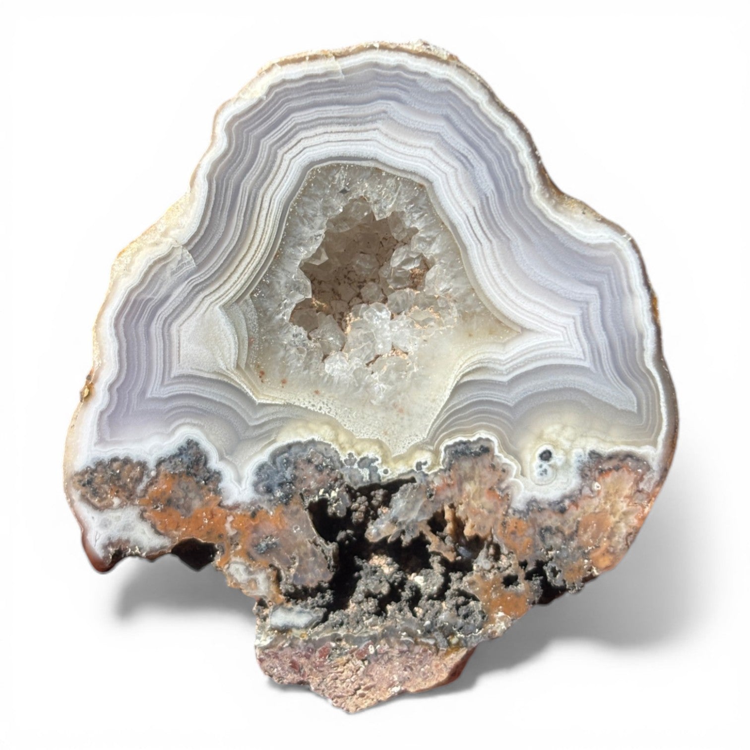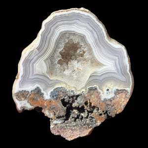 Discover the natural beauty of this Laguna Agate specimen, featuring striking white banding that showcases the stone's elegant layering. The center displays a predominantly quartz composition, while the base reveals fascinating host rock inclusions that tell the story of its geological formation. for collectors seeking authentic mineral character and distinctive patterning.