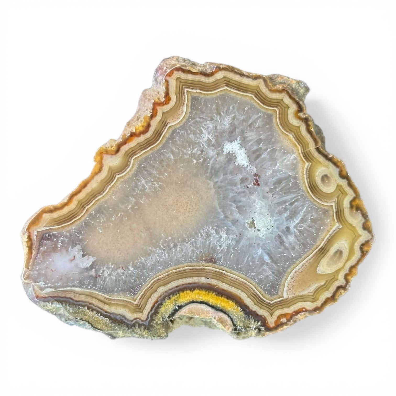 This exquisite Laguna Agate boasts a striking center of quartz, with gorgeous banding and delicate tube formations adorning its exterior.