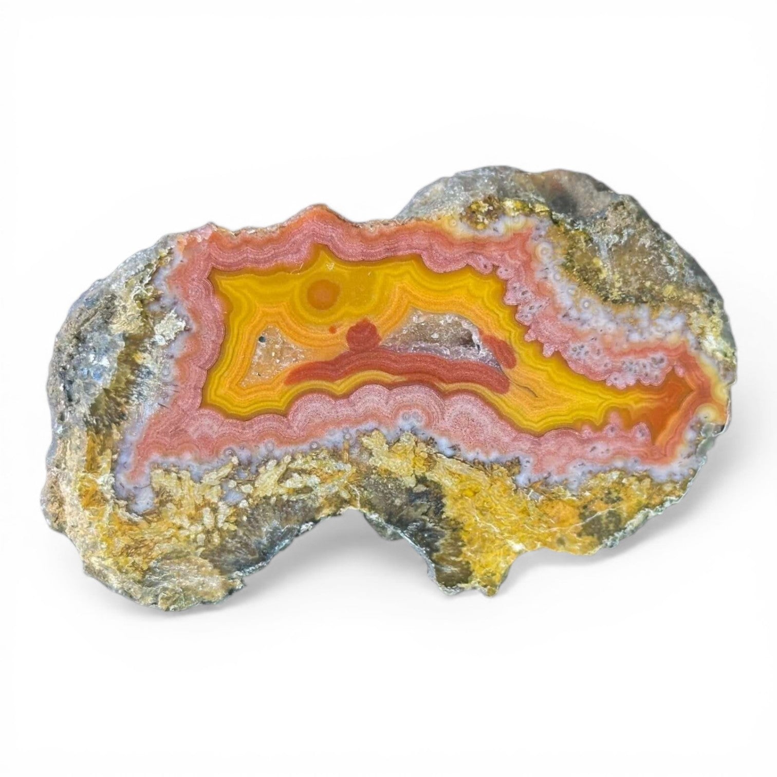 This exquisite Laguna Agate showcases a captivating fortification, displaying a remarkable chromatography phenomenon from gold to rusted iron shades. Its outer part boasts intricate inclusions, creating a truly unique and fascinating stone.