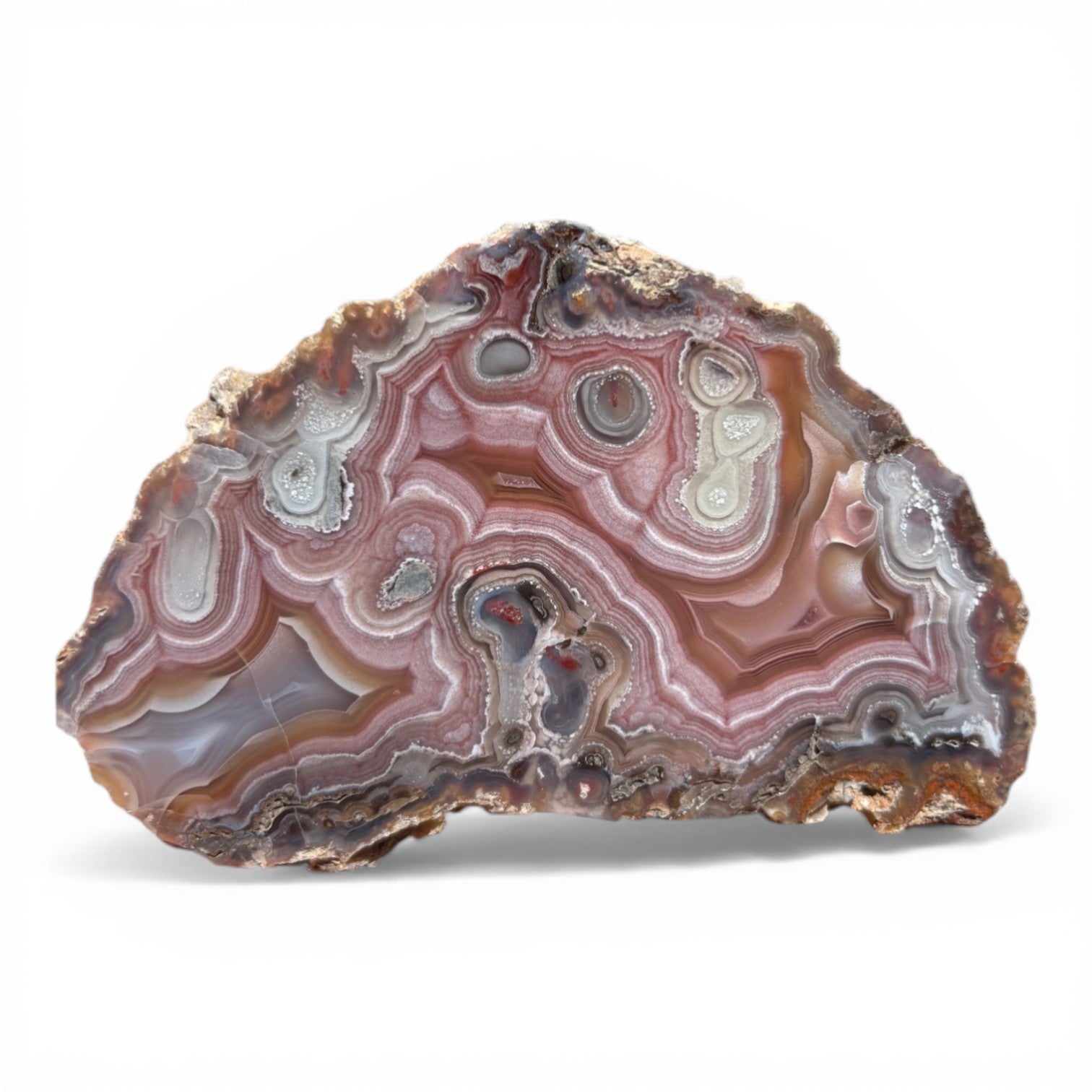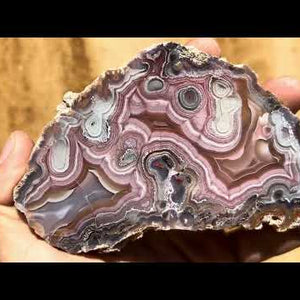 A striking Laguna agate from Chihuahua, Mexico featuring intricate fortification banding in soft mauve, rose, and grey tones. The interior reveals complex swirling structures and natural “eye” formations that give the stone remarkable depth and movement.